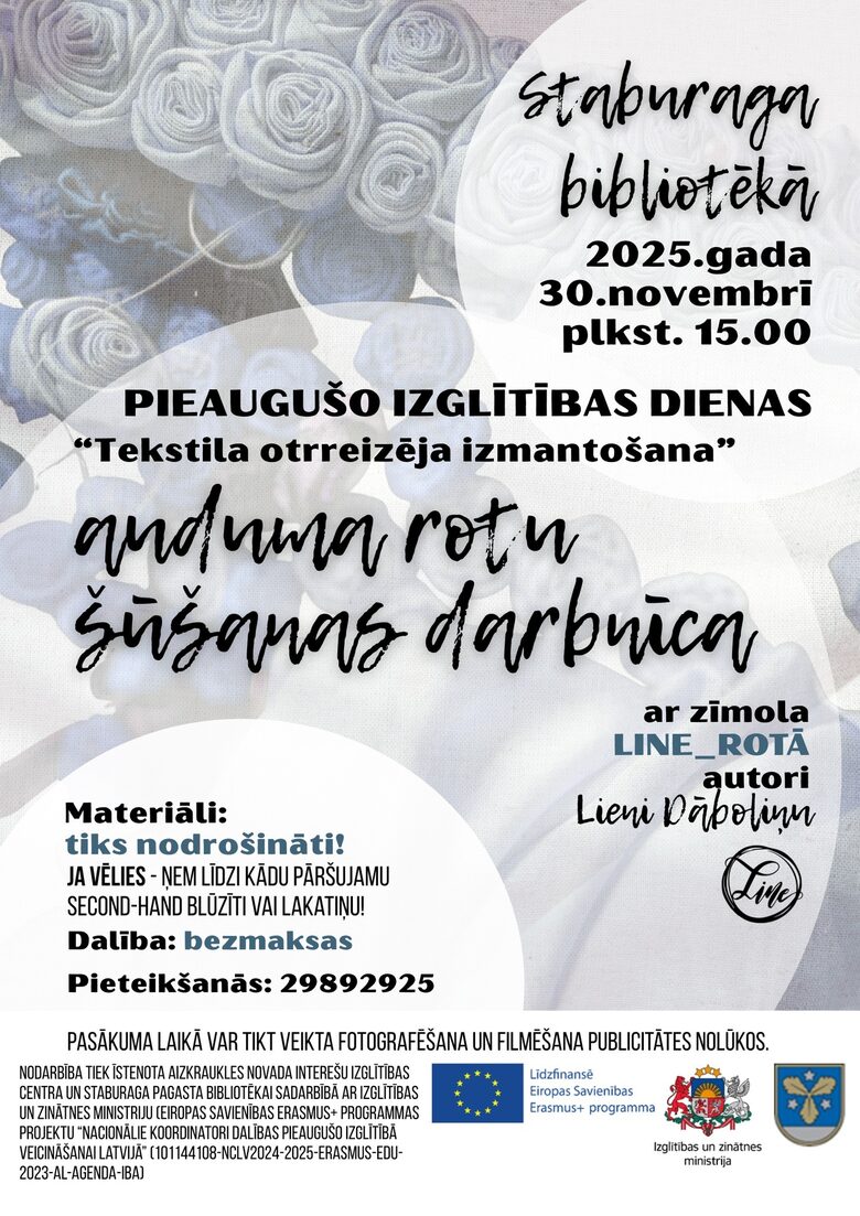 Nodarbība īstenota Aizkraukles novada Interešu izglītības centra un Staburaga pagasta bibliotēkas sadarbībā ar Izglītības un zinātnes ministriju (Eiropas Savienības Erasmus+ programmas projektu “Nacionālie koordinatori dalības pieaugušo izglītībā veicināšanai Latvijā” (101144108-NCLV2024-2025-ERASMUS-EDU-2023-AL-AGENDA-IBA)).